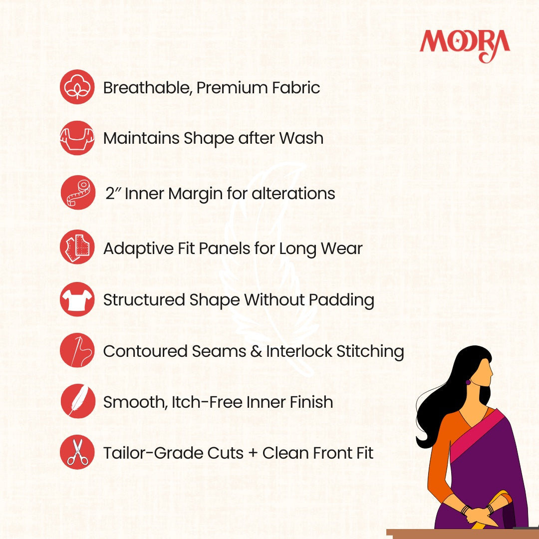 Proudly hand-stitched by skilled women artisans in Rajasthan, this blouse not only adds elegance to your attire but also supports local craftsmanship. Add Moora's black ready-to-wear blouse to your collection today and experience versatility at its best.