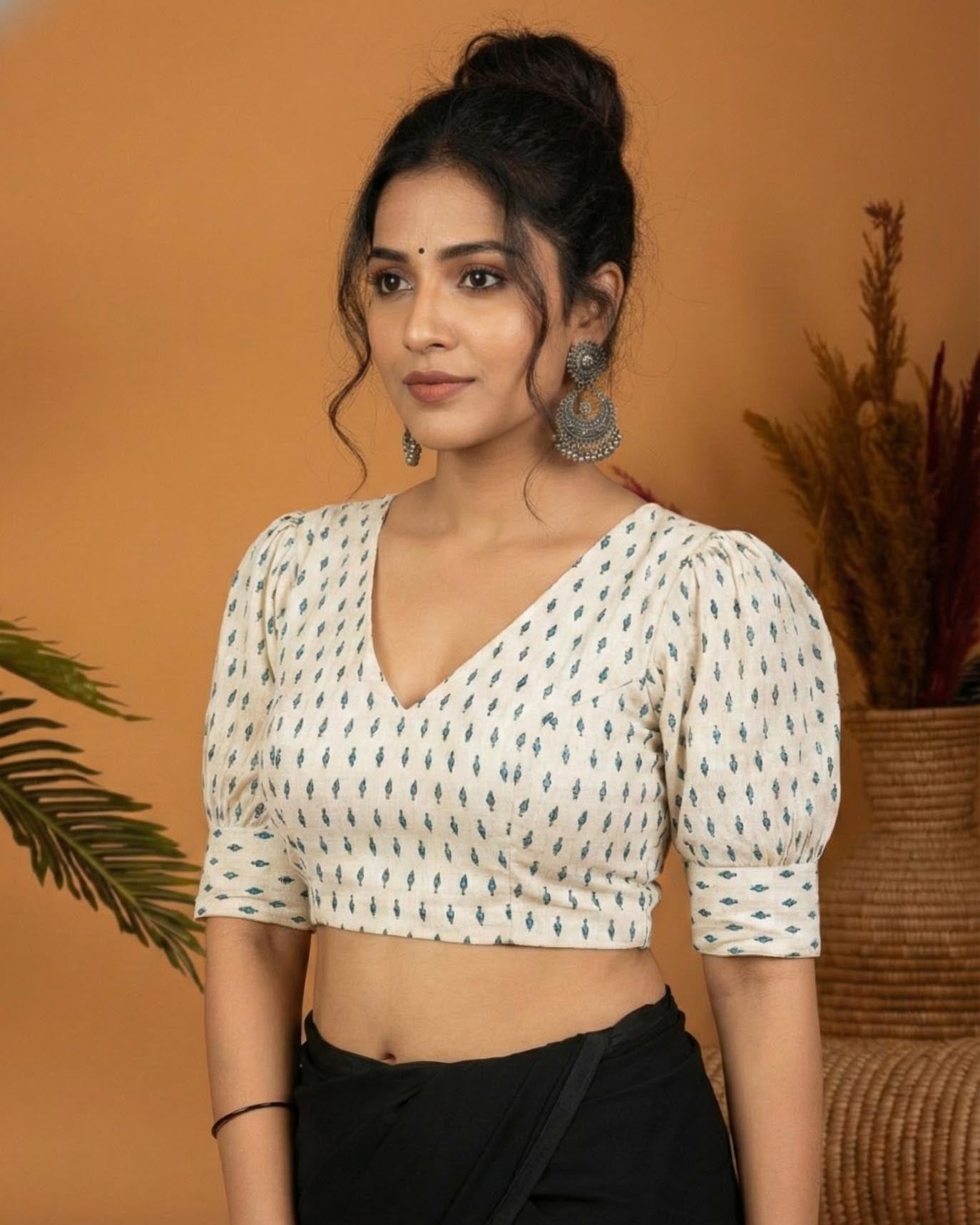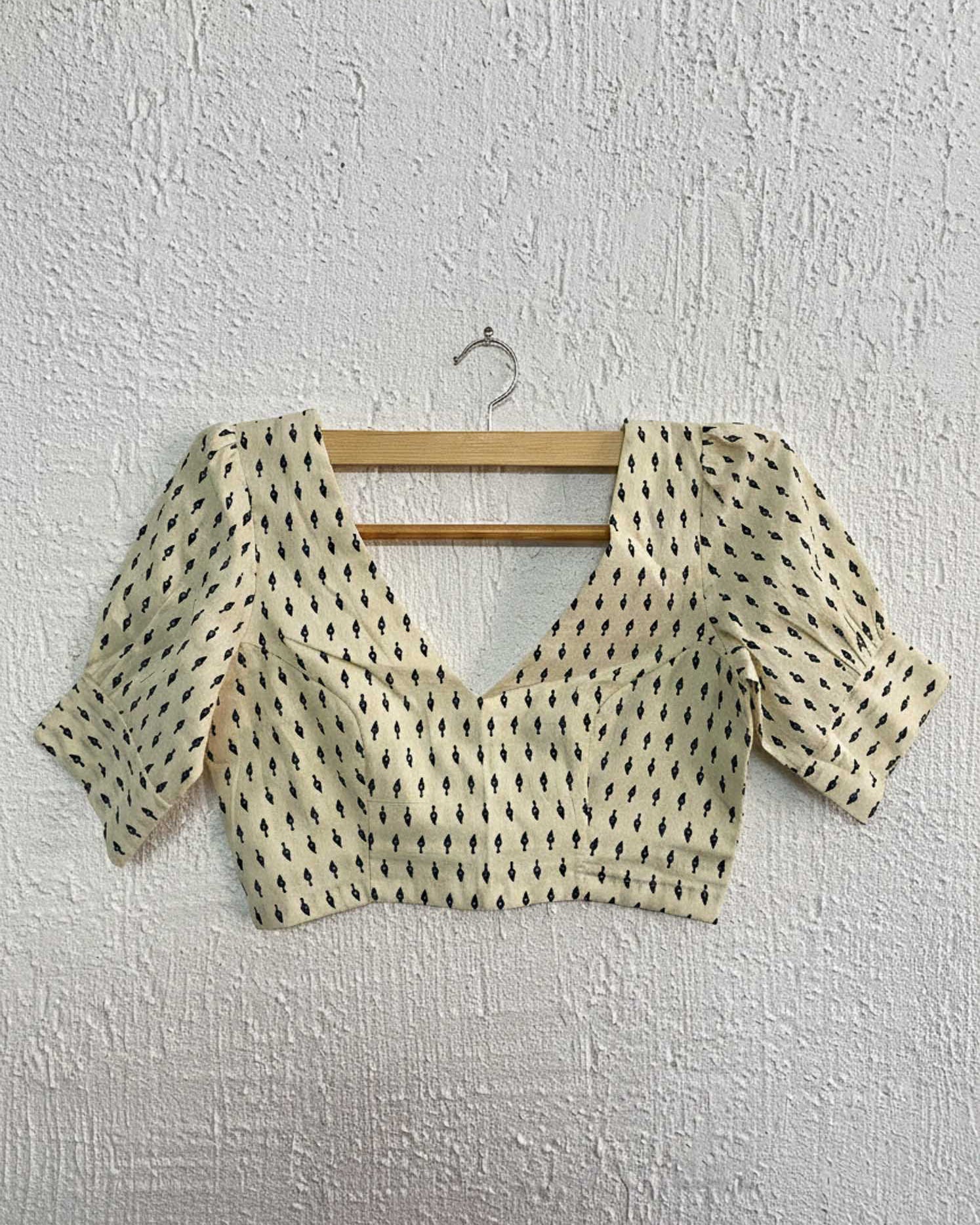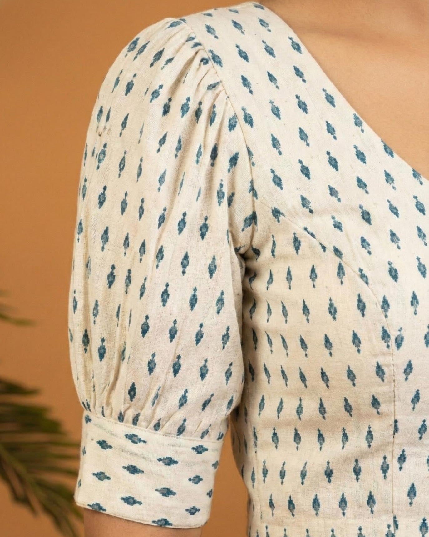 Soft, feminine, and effortlessly stylish - this ivory gathered-sleeve blouse adds a touch of vintage charm to your saree wardrobe. Crafted from breathable cotton with subtle hand-block motifs, it features a flattering V-neckline and a beautifully scooped back for a graceful finish. Style it with solid drapes for an elegant, minimal aesthetic or pair it with printed sarees for a playful fusion look. Perfect for festive wear, work, or casual styling - this blouse stands out with ease.