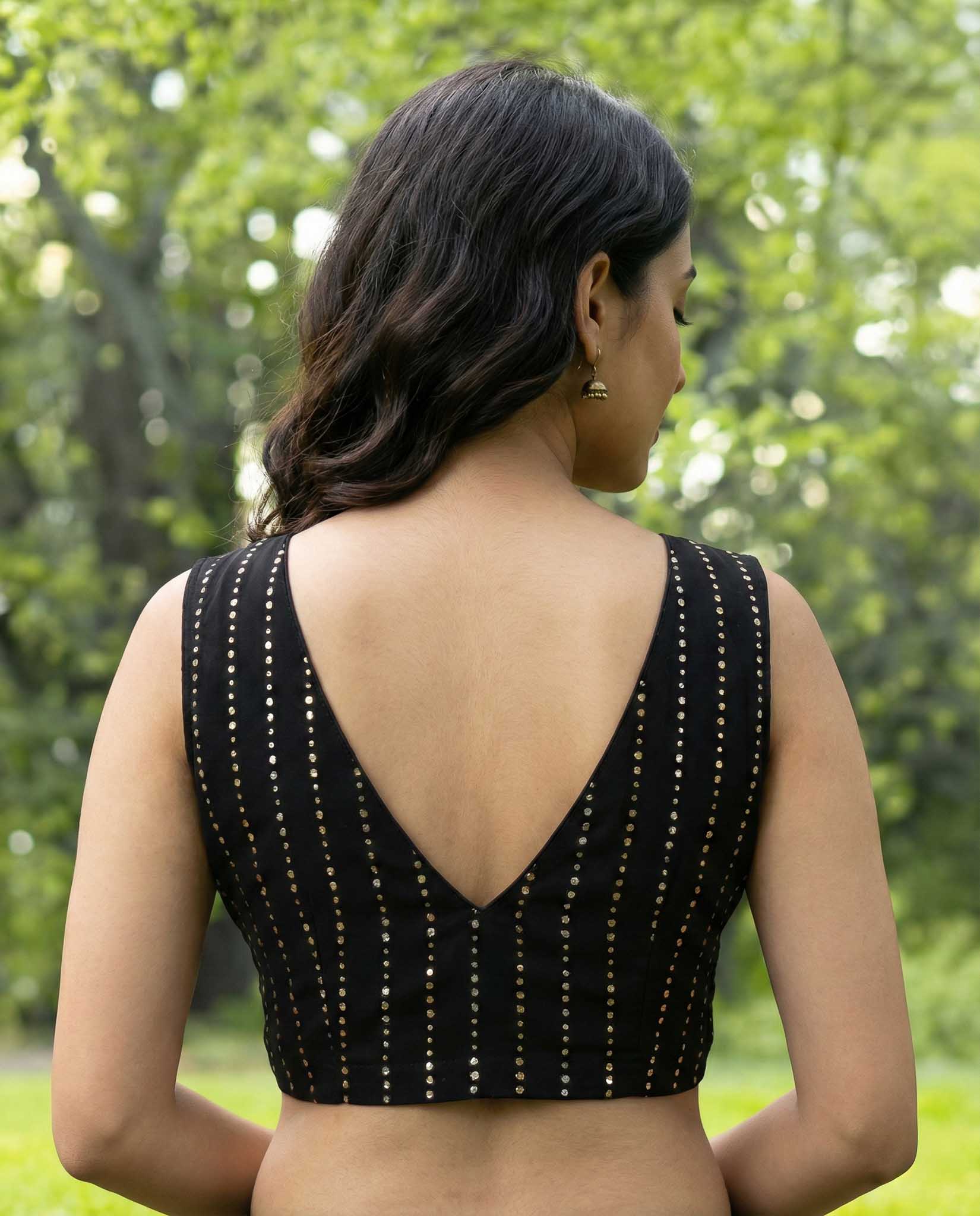 1 Black Sitara - Georgette saree with Sequins + 1 stitched V-neck Black Georgette Sequins Sleeveless blouse + 1 cotton saree cover